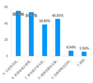 在《湖南法治报》问卷调查中,55.56%的受访者会“主动关注或订阅与自己观点不同的优质信源”;54.17%曾“关闭或减少使用个性化推荐功能”;45.83%通过“阅读深度长文章或书籍”进行系统学习。仅6.94%表示“没有采取过任何措施”。律师谭勇的策略具有代表性:“我会有意识地在不同平台切换,既看社交媒体也看专业报告,避免陷入单一信息流。”这种跨平台、跨信息类型的“主动信息觅食”行为,是抵御算法单一性侵蚀的有效方法。
