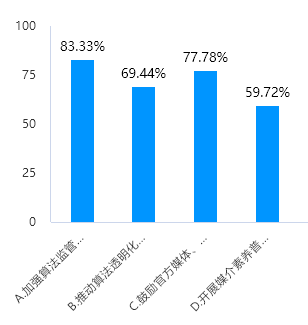 最具根本性的是法律与制度的规制与引领。调查中,公众对治理路径表现出强烈共识:83.33%支持“加强算法监管与立法规范,打击算法滥用行为”;77.78%认为应“鼓励官方媒体、专业机构传播多元、权威信息”;69.44%呼吁“推动算法透明化评估”。