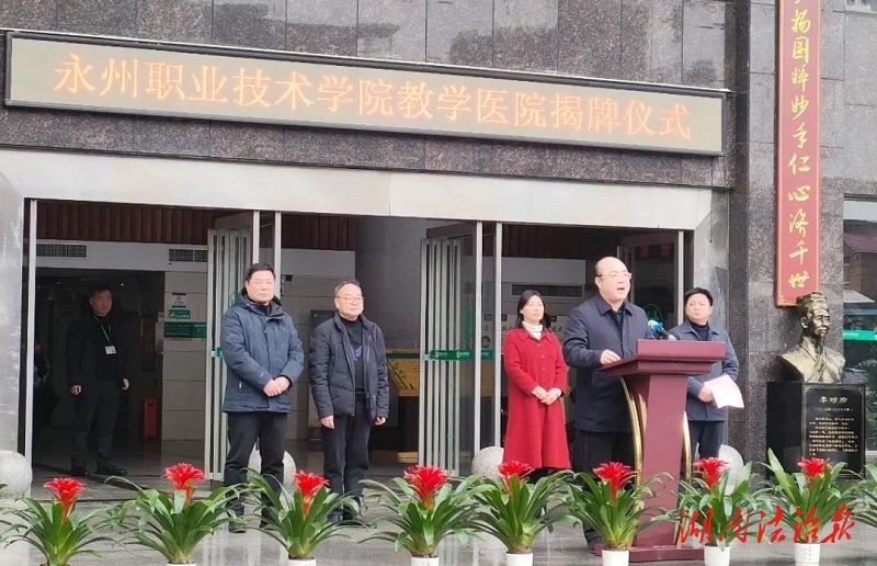 周丽出席揭牌仪式并致辞。她表示,永州职业技术学院是一所办学条件优良、教学底蕴深厚的职业院校,该校人才辈出、名师荟萃,为社会输送了大批优秀技术型人才,每年安排优秀医学生到道县各家医院进行见习,为全县医疗卫生健康事业做出了积极贡献;道县中医医院是一所专科特色突出、设施设备齐全、技术力量雄厚、人才队伍健全、教学师资充实的三级中医医院。目前道县的卫生健康事业正处于高质量发展时期,人才队伍建设是关键。教学医院的挂牌,为实现培养优秀医学生和高水平诊疗技术双赢目标打下基础,也标志着职院与医院进入深度合作阶段,医院要进一步落实好作为教学医院的各项工作,选优配强带教老师队伍,力争打造一流教学实践基地。